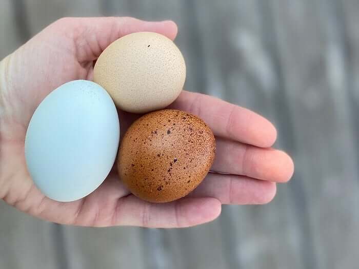 Depending on genetics, an Easter Egger chicken can lay blue, green, olive, pink, or even light brown eggs. Each hen will consistently lay her own color once she starts producing.