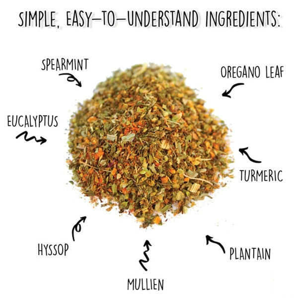 Ingredients: Non-GMO peppermint, mullein, oregano, plantain leaf (Plantago major), powdered turmeric root, and eucalyptus.