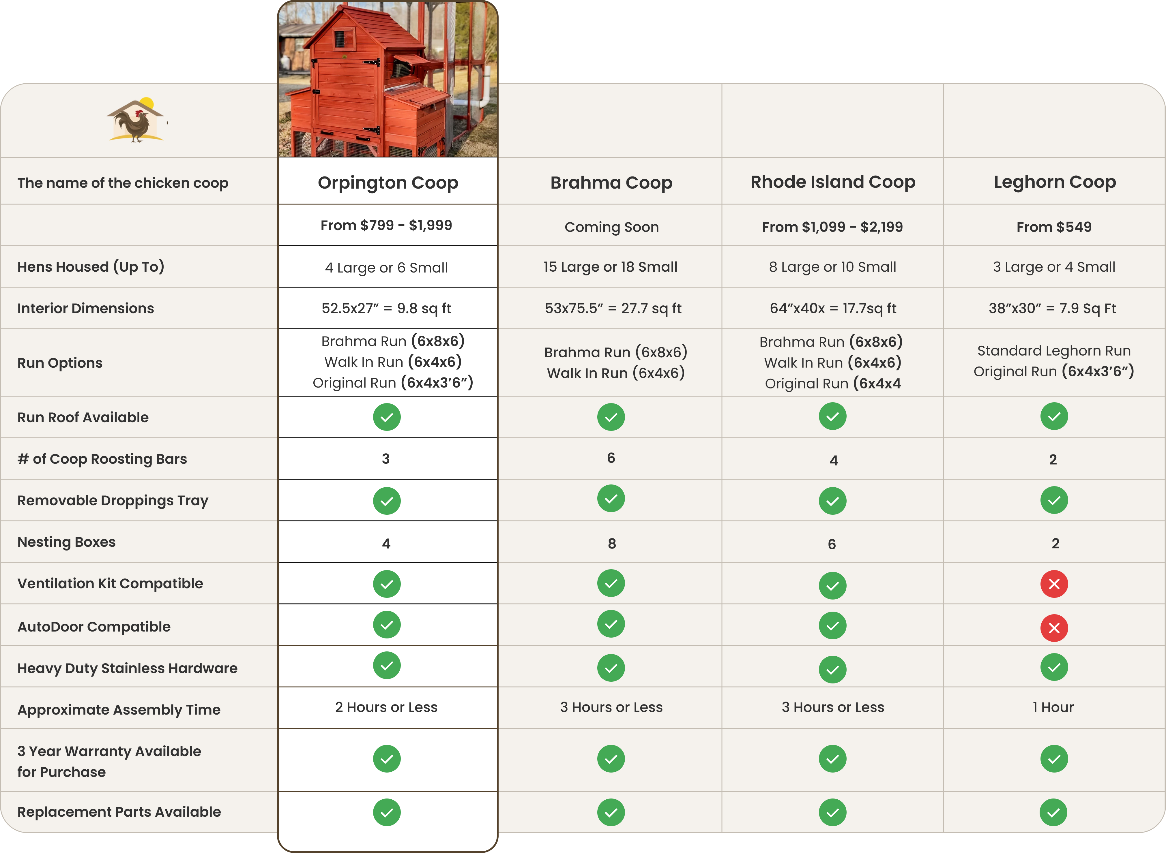 We recommend taking a look at the dimensions below, remembering your girls are only going to be in the hen house to roost at night and lay their eggs. It’s also good to remember the chickens share nesting boxes and stand side by side on the roosting rods. This chicken coop for 6 hens does not include a Run in case you want to expand your setup or in case you already have a run extension.